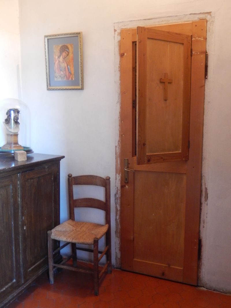Visito la sua cella, con una cassapanca per letto, senza un tavolo, senza una sedia: solo uno sgabello. La sedia di vimini che adesso è lì, le fu portata soltanto poco prima che morisse. L’abito, ancora appeso nell’armadio, è di sacco. In un cassetto gli strumenti di penitenza. Una finestrina si apre sulla chiesa e una porticina dà su un terrazzino stretto stretto. Lavoro, fino a dodici ore al giorno, di intreccio delle palme, a pane e acqua… Una vita impossibile. È l’ultima reclusa.