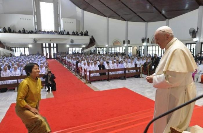 È radiosa Benedetta mentre dona la sua esperienza davanti ai sacerdoti, seminaristi, religiosi e missionari thailandesi, ma soprattutto davanti al Papa, a Bangkok, in Tailandia.